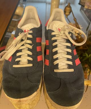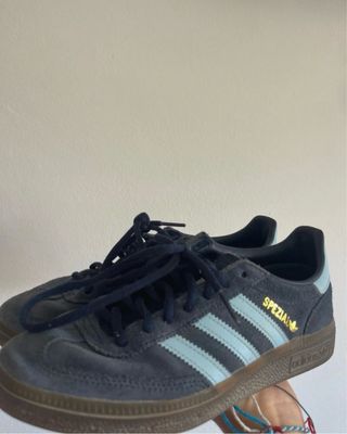 Zapatillas Adidas Spezial en color azul marino con las clásicas tres rayas blancas. Suela de goma en tono caramelo. Muy cómodas y combinables, perfectas para el día a día. Están en buen estado, con algo de uso visible en la puntera pero sin desperfectos importantes. Talla 37 1/2. #adidasoriginals #summer