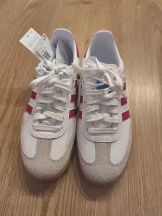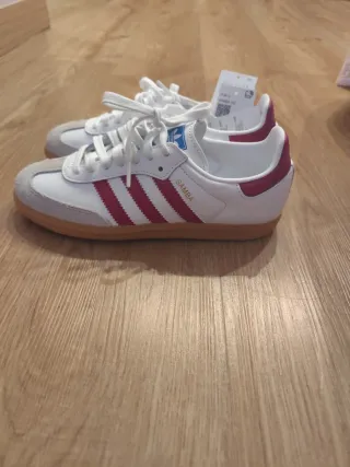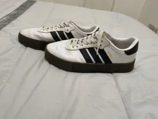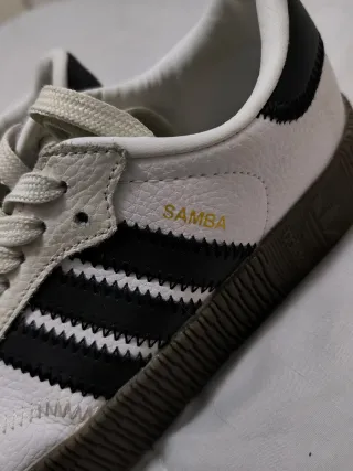 Zapatillas Adidas Samba en talla 36. Diseño clásico con las icónicas tres rayas. - Parte superior de cuero blanco. - Detalle de las tres rayas negras. - Nombre SAMBA en dorado. No tiene los cordones originales.