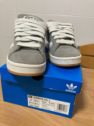 Zapatillas Adidas Campus originales en color gris y blanco. Perfectas para el día a día, caja original, nuevas 120€. - Diseño clásico de Adidas. - Tres rayas laterales en blanco. - Cordones blancos y grises - Suela de goma. - Logo de Adidas en la lengüeta y el talón.