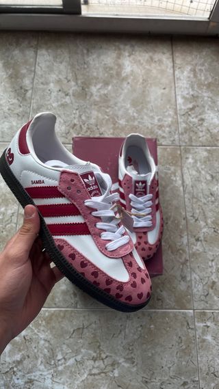 Zapatillas Adidas Samba OG en colaboración con Comme des Garçons. - Diseño con estampado de corazones. - Detalles en color burdeos y blanco. - Cordones blancos.