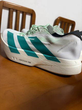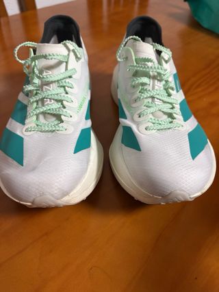 Zapatillas de running Adidas Adizero Adios Pro 4. - Diseño con franjas en verde azulado y blanco. - Detalle LIGHTSTRIKE PRO en la suela. - Inscripción ADIZERO ADIOS PRO 4 en el talón.. Usadas solamente 21km en una media maraton , no las uso mas porque me apretan . Y ya no puedo descambiarlas por otra talla mas . NO HAGO ENVIOS . NO HAGO REBAJAS NI BAJO MAS EL PRECIO. NO CONTESTO A OFERTAS .