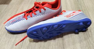 Zapatillas de fútbol con un diseño llamativo. - Parte superior blanca con detalles en azul. - Cordones y forro interior en color rojo. - Suela azul.