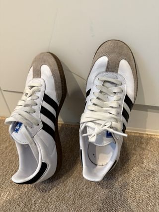 Zapatillas Adidas Samba de mujer en talla 39 1/3. Combinan blanco y gris. puestas exactamente 3 veces como se puede ver en la suela. - Diseño clásico. - Tres rayas laterales. - Detalle de gamuza en la puntera.