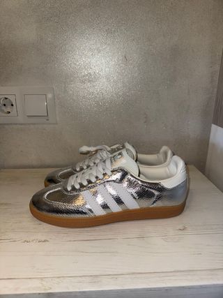 Zapatillas Adidas Samba con un llamativo acabado plateado y detalles blancos. - Diseño con las icónicas tres rayas. - Suela de goma marrón. - Cordones blancos.