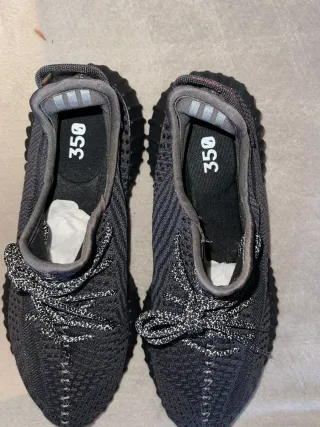 Zapatillas Adidas Yeezy 350 en color negro, talla 42. Vienen nuevas y con su caja original. - Diseño moderno y cómodo. - Cordones reflectantes. - Suela de goma. - Detalle de tres rayas en el talón.
