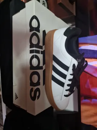 Tenis de la marca Adidas con un diseño clásico. - Combinación de colores blanco y negro. - Suela de goma en tono marrón.talla 41,5