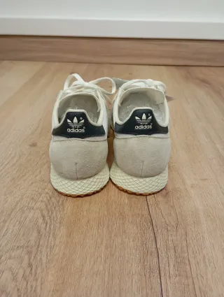 Zapatillas deportivas Adidas en tonos beige y gris. Perfectas para el día a día. - Diseño moderno. - Cordones blancos. - Detalle de las tres bandas. - Suela de goma. - Precio negociable. - Sin caja.