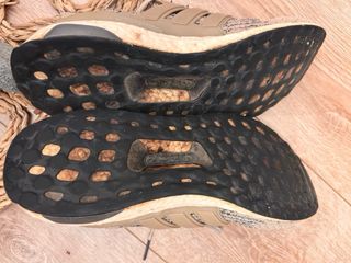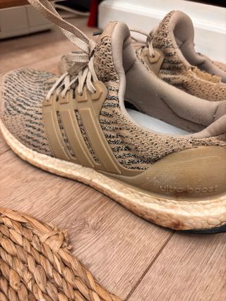 Zapatillas Adidas Ultraboost en color beige y marrón.42.5 muy poco uso vendo ya que tengo varios pares de este modelo. solo tiene ese desperfecto de la cuarta foto. la goma de las suelas se queda fea muy rápido ya que el material es poroso y no se puede quitar las marcas. zapatilla tope de gama de running con muy poco uso.nunca lavadas.la tela está impoluta y los cordones igual muy cómodas