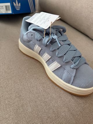 Zapatillas Adidas Campus con un diseño clásico y moderno. - Parte superior de ante negro. - Detalle de las tres rayas blancas. - Suela de goma. - Cordones blancos gruesos. son talla 38 pero calzan pequeñas