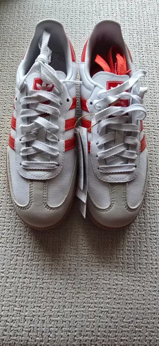 Zapatillas Adidas Samba OG para mujer en un llamativo diseño, A ESTRENAR con etiqueta original; talla 38. - Combinación de colores rojo y blanco. - Suela de goma. - Diseño clásico de tres rayas.
