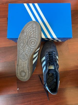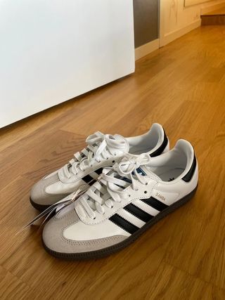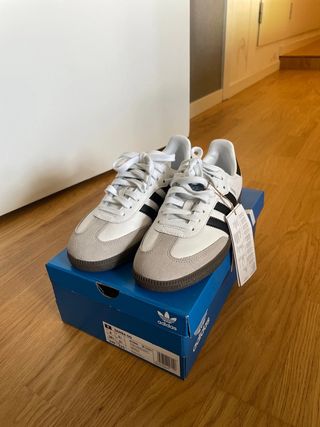 Zapatillas Adidas Samba clásicas en blanco y negro. - Parte superior de cuero y gamuza. - Suela de goma. - Tres rayas características de Adidas. Caja rota/Las vendo porque no me valen.