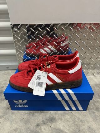 Zapatillas Adidas en color rojo y blanco, talla 41. Vienen en su caja original. - Modelo: FV1227 - Diseño clásico con las tres rayas. - Suela de goma marrón.