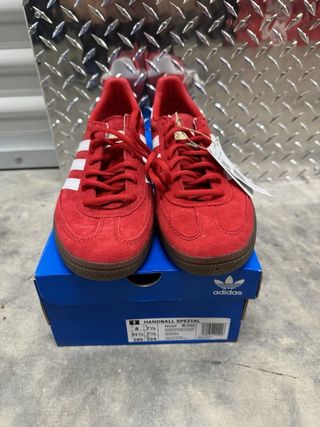 Zapatillas Adidas Handball Spezial en tonos beige y rojo. Un clásico del diseño deportivo. - Parte superior de ante. - Detalle de las tres rayas en contraste. - Forro interior en color burdeos.