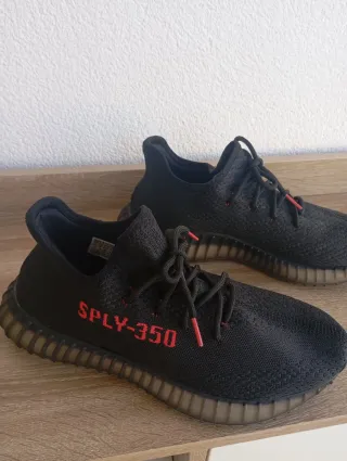 Zapatillas Adidas Yeezy 350 V2 en color negro con detalles en rojo. - Diseño moderno y cómodo. - Parte superior de tejido Primeknit. - Suela de goma semitransparente. +Yo uso un 43 y me sirven