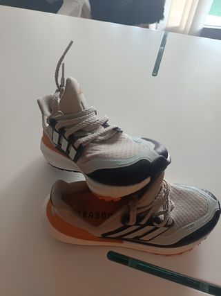 Vendo un par de zapatillas Adidas en tonos beige y naranja. Están en muy buen estado. - Modelo Traboo. - Diseño moderno y ligero. - Suela con buen agarre.