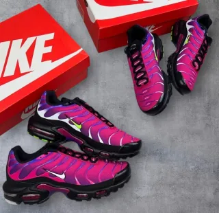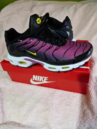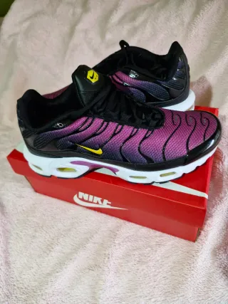 Zapatillas Nike Air Max Plus TN con un degradado vibrante. - Diseño llamativo en tonos rosa y morado. - Detalles en negro y amarillo. - Suela blanca con unidades de aire visibles. Número 42. NUEVAS, solo puestas para probar. Negociable.