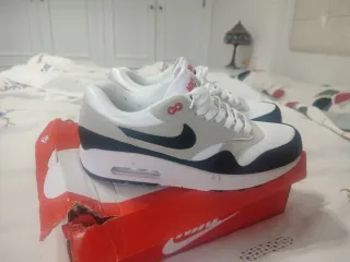 Zapatillas deportivas Nike Air Max 1. - Diseño moderno en tonos azules y blancos. - Detalle del logo Swoosh en los laterales.