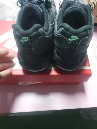 Zapatillas Nike Air Max 95 con un diseño moderno y detalles llamativos. - Combinación de colores negro, gris y verde. - Logotipo de Air Max en la lengüeta. Le falta el cordon zapato derecho