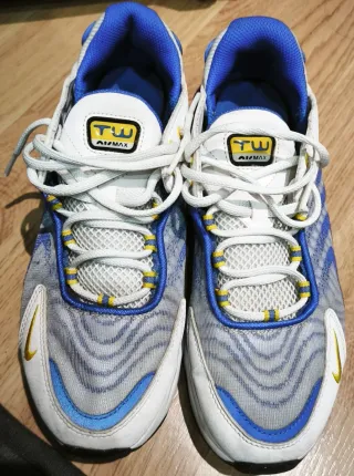 Zapatillas deportivas Nike Air Max TW con un diseño moderno y llamativo. - Combinación de colores azul y blanco. - Detalle de logo Swoosh en amarillo. - Cierre con cordones blancos.