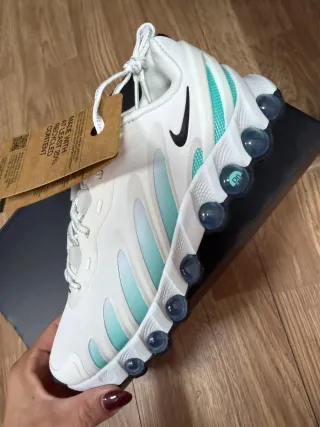 Zapatillas deportivas Nike Air Max con un diseño moderno y llamativo. - Combinación de colores blanco, gris y verde azulado. - Detalle del logo de Nike en la lengüeta y el lateral. - Suela con tecnología Air Max visible.