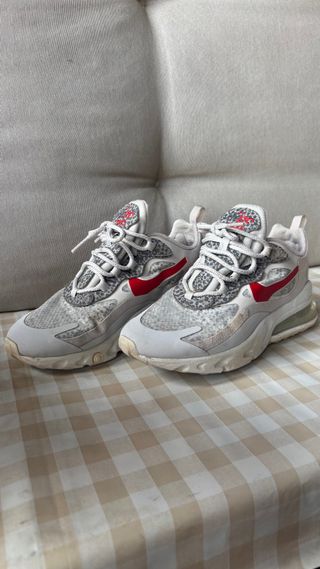 Zapatillas deportivas Nike Air Max 270 React con un diseño moderno y llamativo. - Combinación de colores blanco y rojo. - Estampado animal print en la parte superior. - Suela con tecnología React para mayor comodidad.