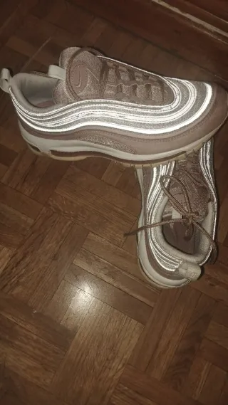 Zapatillas Nike Air Max 97 con un diseño llamativo. - Combinación de colores rosa y plateado. - Detalles reflectantes en las líneas. - Suela blanca y marrón.