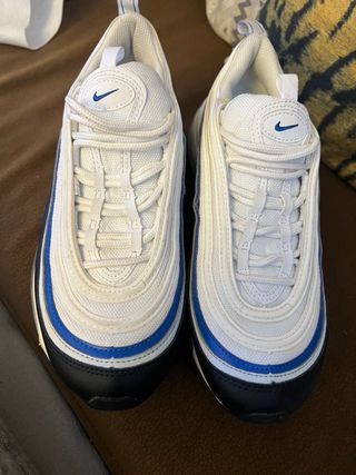 Vendo un par de zapatillas Nike Air Max 97. Están en buen estado, aunque muestran señales normales de uso. - Modelo Air Max 97 - Diseño clásico con detalles en azul y blanco - Suela con cámara de aire visible
