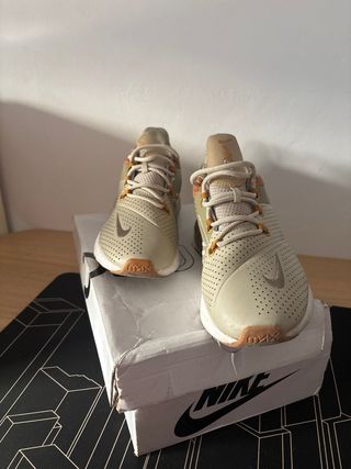 Zapatillas deportivas Nike Air Max 270 con un diseño moderno y detalles únicos. - Combinación de colores beige y verde oliva. - Perforaciones en la parte superior para mayor transpirabilidad. - Suela con unidad Air Max visible en el talón.