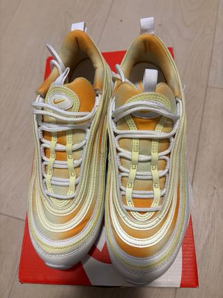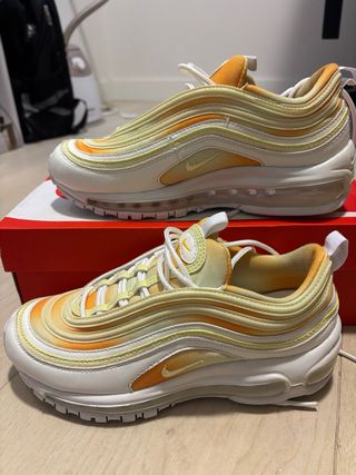 Zapatillas Nike Air Max 97 con un diseño degradado en tonos naranjas y amarillos sobre base blanca. - Diseño ondulado característico. - Suela con amortiguación visible. - Swoosh de Nike en los laterales. Usadas una vez