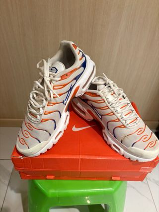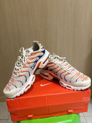 Zapatillas Nike Air Max Plus TN con un diseño llamativo en naranja y blanco. - Parte superior de malla transpirable. - Detalle de líneas curvas en naranja y azul. - Suela con unidades Air Max visibles.