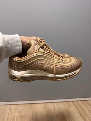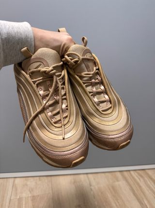 Zapatillas Nike Air Max 97 en color dorado. - Diseño icónico con líneas onduladas. - Detalles en blanco en la suela y el interior. - Cierre con cordones.