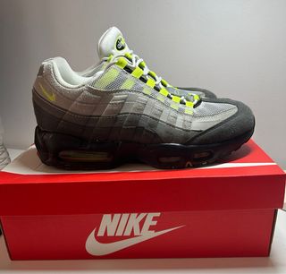 Zapatillas Nike Air Max 95 con detalles en color neón. Se encuentran en muy buen estado. - Diseño icónico Air Max 95. - Combinación de grises y verde neón. - Unidad Air visible en la mediasuela.