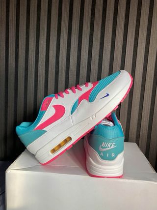 Zapatillas Nike Air Max 1 NBY, By You en talla 47.5. Un diseño llamativo con detalles en rosa, turquesa y blanco. Caja sin tapa Nuevas - Combinación de colores vibrante. - Estilo deportivo y moderno.