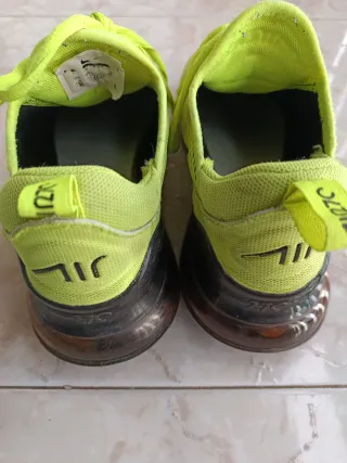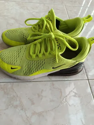 Botines deportivos Nike Air Max 270 en llamativos tonos verdes y amarillos. Perfectos para un estilo urbano y activo. - Diseño moderno y transpirable. - Suela con amortiguación Air Max. - Cierre con cordones. Me lo regalaron y solo me los puse 2 veces y muy poco tiempo por motivos que tengo 2 pares parecidos .si precio en tienda es 95 eur .