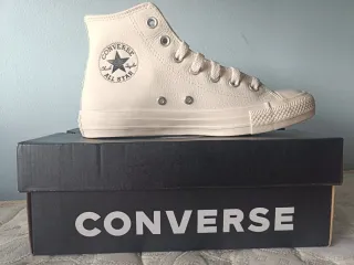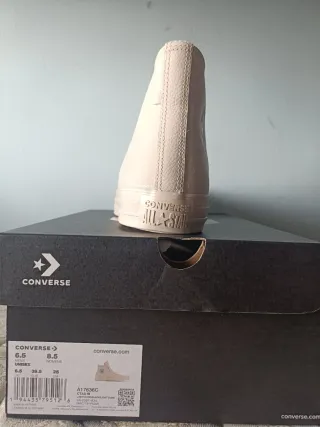 ¡Converse Chuck Taylor All Star Lift Platform (caña alta con suela plataforma chunky) en color Egret (beige crudo/off-white premium con detalles dorados en ojales y logo)! Talla EUR 39 / US 8 Women (planta 24.5 cm). Usadas solo un par de veces (prácticamente nuevas / excelente estado). Se venden porque me quedan un pelín grandes y ya pasó el plazo de devolución, pero están impecables, sin defectos ni roces. Ideales para looks casual, streetwear o elevar cualquier outfit. Muy cómodas y tendencia atemporal. (Sin caja original)