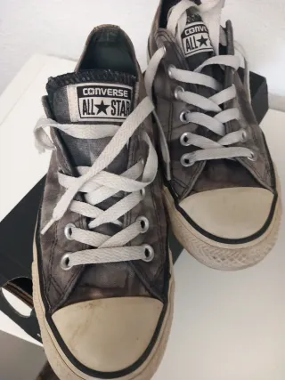 Zapatillas bajas Converse All Star en color gris. - Cierre de cordones. - Suela de goma blanca. - Detalle de logo en la lengüeta. Las vendo por 14,90€, económica porque están un poco desgastado por dentro, se ve en las fotos