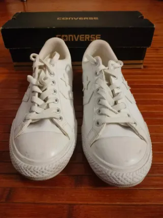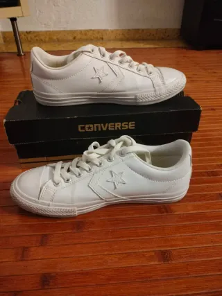 Zapatillas Converse All Star de corte bajo. - Color blanco. - Cordones blancos. - Banda con franja roja,muy elegantes y en perfecto estado ,usadas 4 veces ,me la compré con mi hijo y no le gustan,visten mucho y son muy comodas