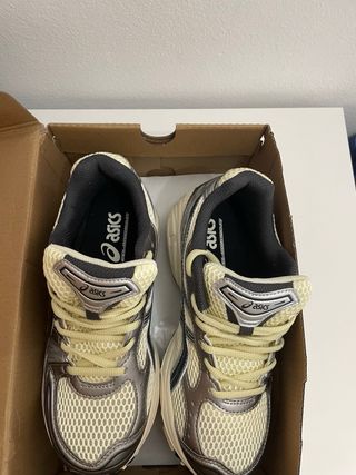 Zapatillas deportivas ASICS en tonos beige y gris. Perfectas para el día a día. - Diseño moderno y cómodo. - Materiales de calidad. -porblema tiene la caja dañada pero las bambas en perfecto estado nuevas