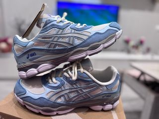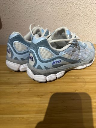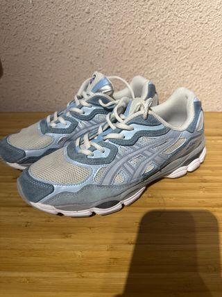 Zapatillas Asics Gel NYC en tonos grises, blancos y un poco de celeste, Diseño moderno. Son talla 41,5 pero en verdad es como unas talla 40,5 o 41. Originales✅ Nunca se han usado✅ Con su caja original✅ Comodas✅
