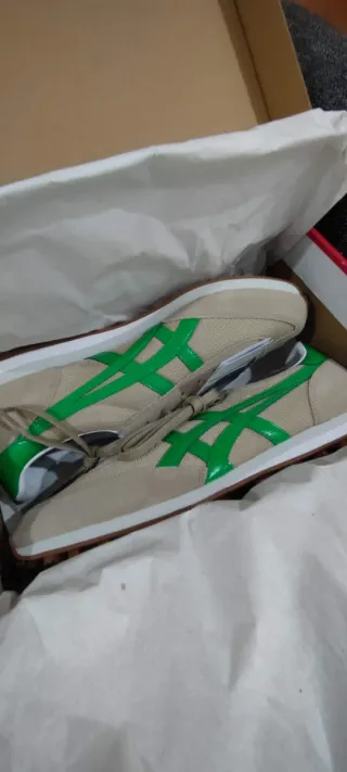Zapatillas deportivas Asics con un diseño clásico y cómodo. Las vendo porque es un 46 pequeño, creo que a un 45 de toda la vida le ajustan perfectamente. Muy poco uso - Combinación de colores blanco y verde. - Cierre con cordones.