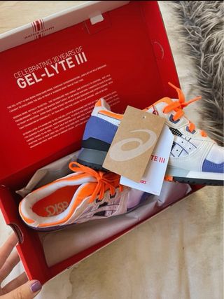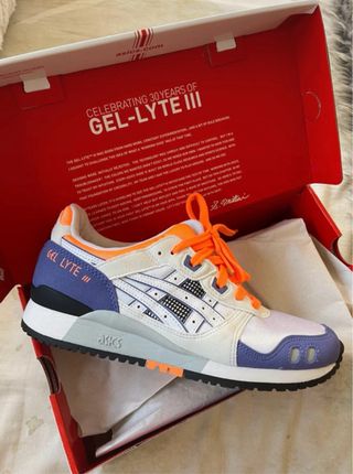 Zapatillas deportivas ASICS Gel-Lyte III con una combinación de colores llamativa. - Diseño con detalles en morado y turquesa. - Logo de ASICS en el lateral. - Cordones en color turquesa.