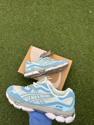 Zapatillas Asics Gel NYC en tonos azul claro y blanco. Diseñadas para ofrecer comodidad. - Detalle de la tecnología Ortholite en la plantilla. - Paneles de malla transpirable. - Suela con amortiguación.