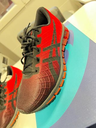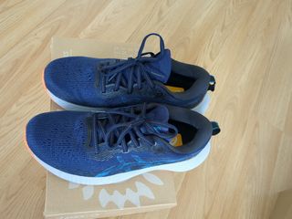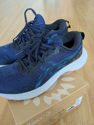 Zapatillas de trail running Asics Fujispeed en talla 39.5. - Diseño en azul oscuro con detalles en naranja. - Cordones de ajuste rápido. - Suela con buen agarre. Usadas solo 15 días por problemas con mi pisada de probador. En perfecto estado.