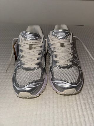 Zapatillas Asics Gel Kayano 14 en tonos plateados y blancos. - Diseño deportivo y moderno. - Detalles en malla transpirable. - Suela con tecnología GEL para mayor amortiguación. -Nuevas sin usar