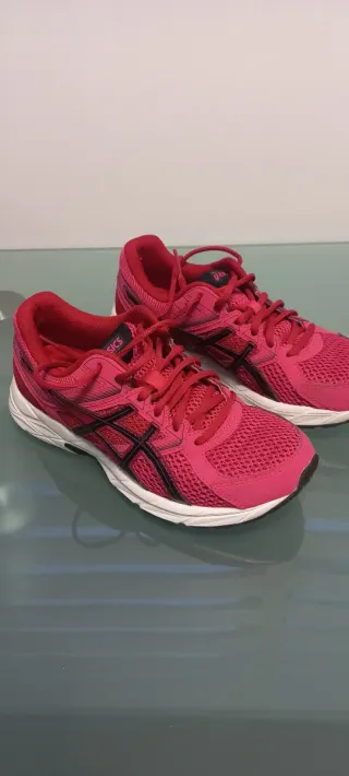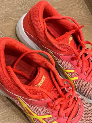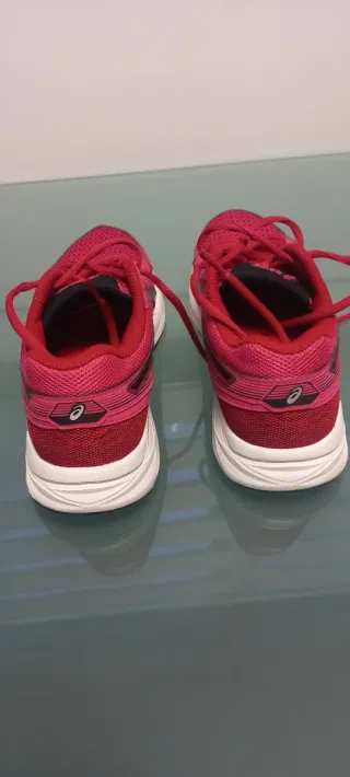 Vendo zapatillas deportivas Asics. Son de color rojo y amarillo, y están en buen estado. - Ideales para hacer deporte. - Cómodas y ligeras. - Talla de mujer.