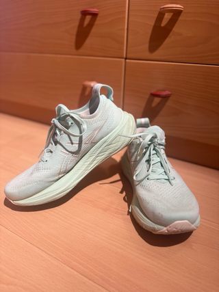 Zapatillas deportivas Asics Nimbus 26 en color verde menta. Diseñadas para ofrecer comodidad y rendimiento. - Parte superior de malla transpirable. - Máxima amortiguación de la gama. - Suela de goma duradera. Con poco uso. Número 40 (25,5cms)