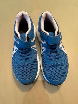 Zapatillas deportivas Asics para niños en color azul y blanco. Cuentan con cierre de velcro para mayor comodidad. - Diseño deportivo. - Cierre de velcro. - Logo de Asics en los laterales y la lengüeta.