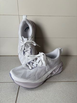 Zapatillas running Asics Novablast 5. Color blanco con detalles morados. Talla 37.5. Únicamente 2 usos (20kms): Prácticamente nuevas (las vendo porque no son mi talla). - Parte superior de malla transpirable. - Mediasuela con tecnología FF BLAST PLUS. - Suela de goma duradera. Una pasada las sensaciones con ellas.