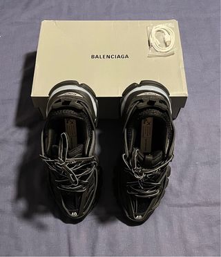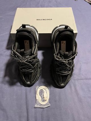 Zapatillas Balenciaga Modelo: Track3 Color: Negro Talla: 38 • Zapatillas 100 % sin piel • Talla escrita en el borde de la punta • Track en relieve en la parte posterior del tacón • BB en relieve en la parte frontal de la suela exterior • Logotipo estampado en el exterior • Logotipo en relieve en la lengüeta • Cinta en la parte posterior y en la lengüeta • Diseño de suela con arco de 50 mm Estan sin estrenar. Se incluye bolsa de transporte y cordones de repuesto. Tambien tengo de la talla 37 y 39.