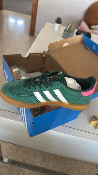 Zapatillas Adidas Gazelle a estrenar, con un diseño llamativo. - Exterior de ante verde. - Detalle en el talón de color rosa. - Suela de goma marrón. - Tres rayas blancas laterales.